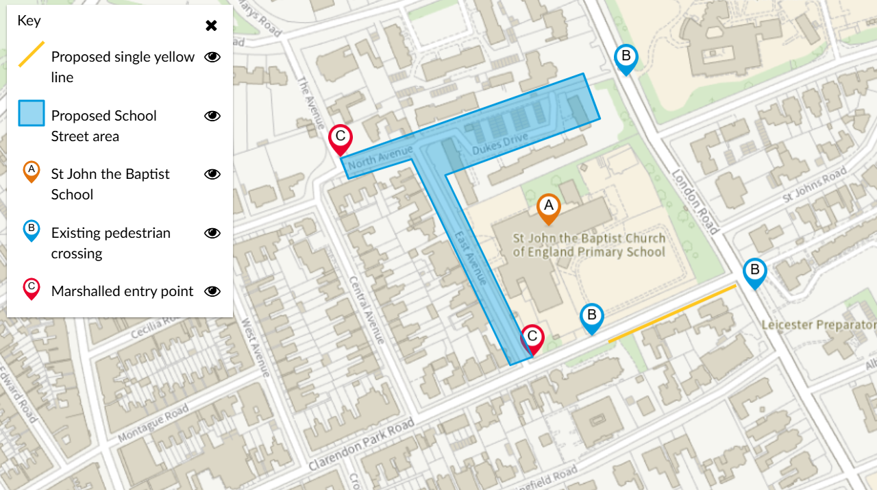 A map showing the proposed school street scheme for St John the Baptist school. It includes the extent of the school streets, the marshalled entry points, the current pedestrian crossing and the proposed single yellow line.
